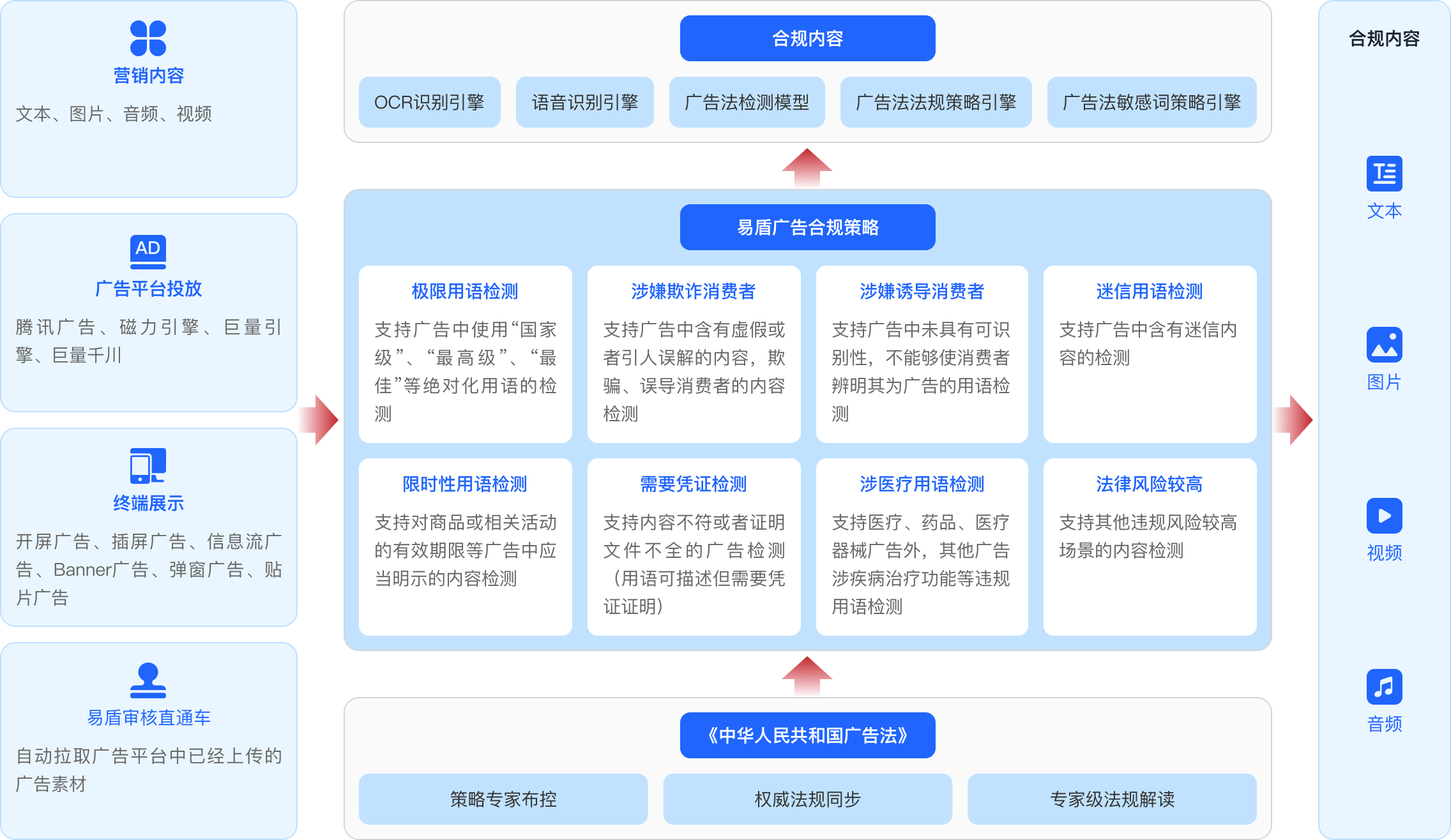 审核功能覆盖广告内容生产、上传、投放、C端展示等多个环节,全方位检测广告合规情况